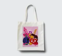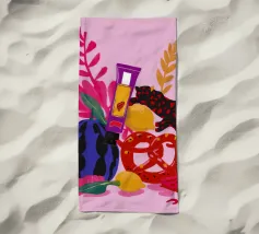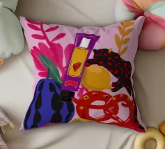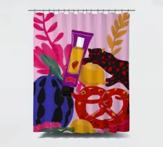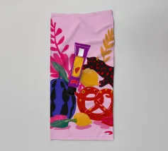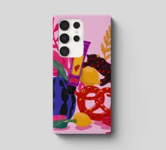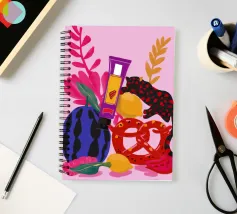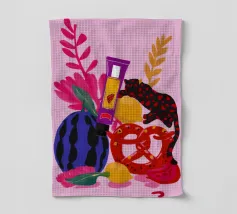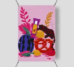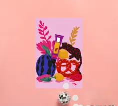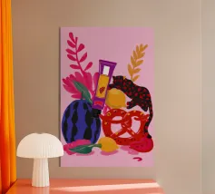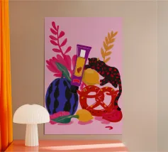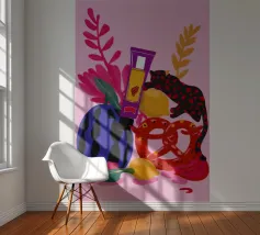 Una tavola surreale esplode di colori audaci di frutta, tubi, motivi e sfondi rosa esplosivi.
