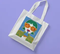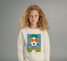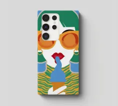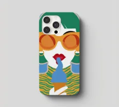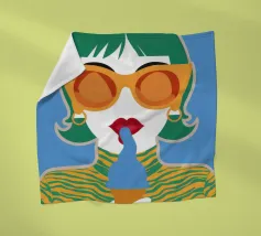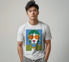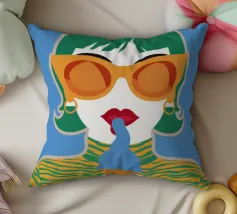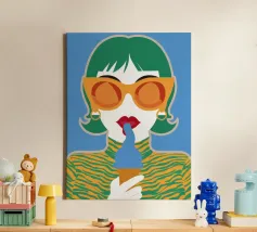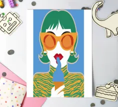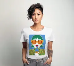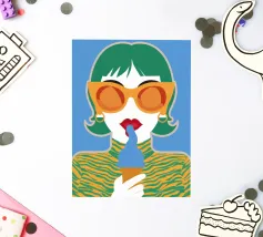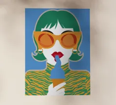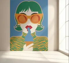 Un ritratto pop art audace ed elegante di una donna con capelli corti verdi, grandi occhiali da sole arancioni e un top a fantasia. La sua espressione sicura e la palette di colori vivaci creano una dichiarazione di moda chic e moderna.