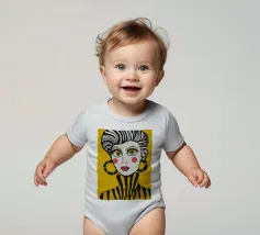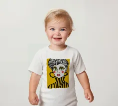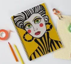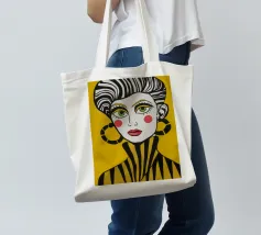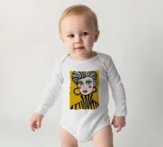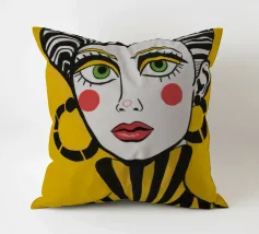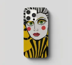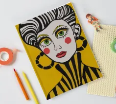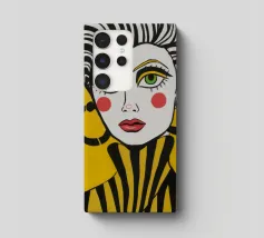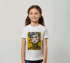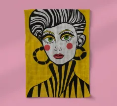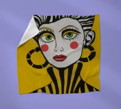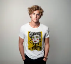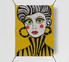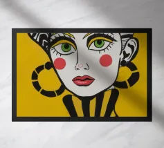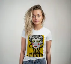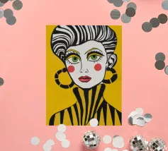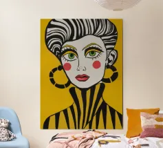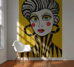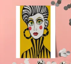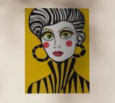 Un vibrante ritratto in stile pop art di una donna con un trucco accattivante, grandi orecchini a cerchio e un dolcevita a righe. I colori audaci, le linee grafiche e lo sguardo diretto creano una dichiarazione potente e sicura.