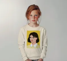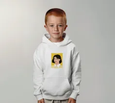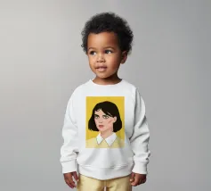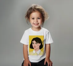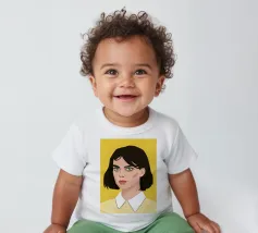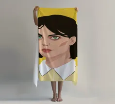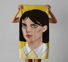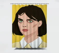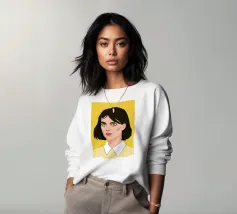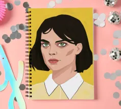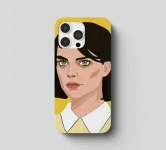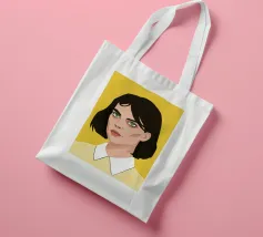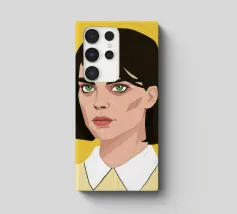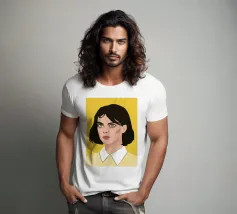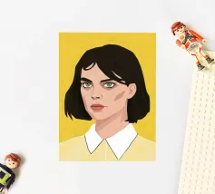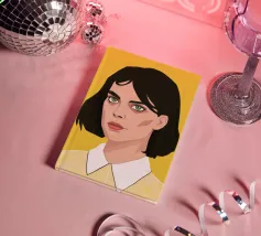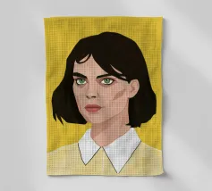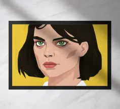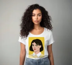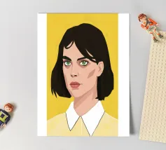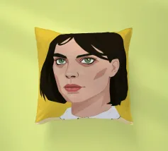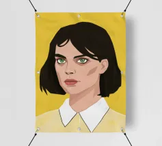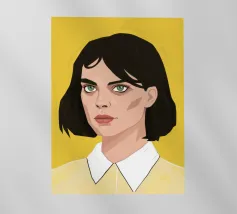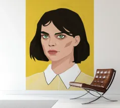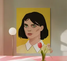 Un suggestivo ritratto di donna dai capelli scuri e dagli occhi intensi, su un solido sfondo giallo. Lo stile minimalista si concentra sul suo sguardo accattivante e diretto.