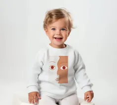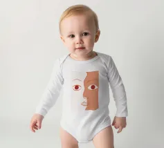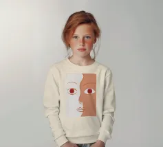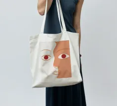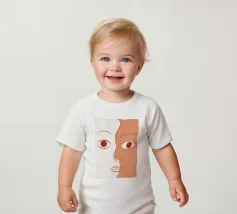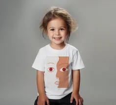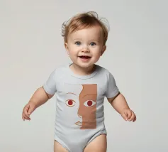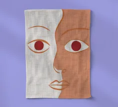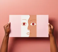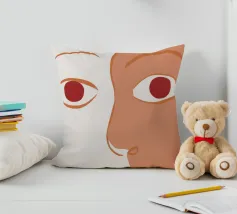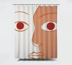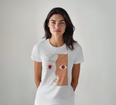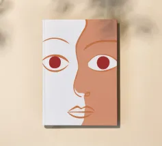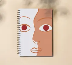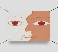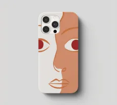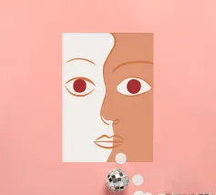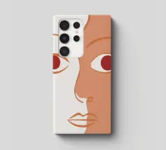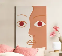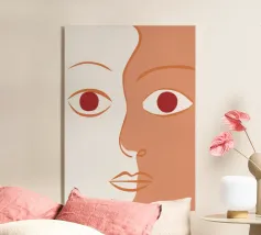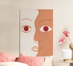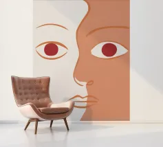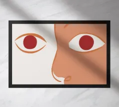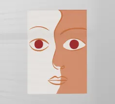 Un primo piano estremo di un volto è ridotto alle sue forme essenziali e minimaliste, con due espressivi occhi rosso-arancio che guardano direttamente lo spettatore da uno sfondo beige e astratto.