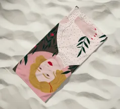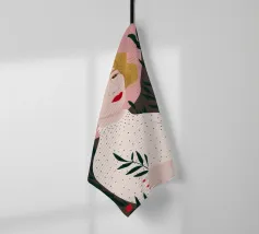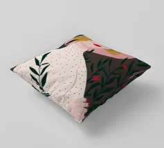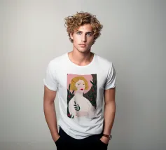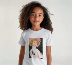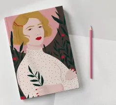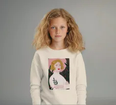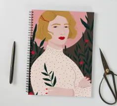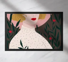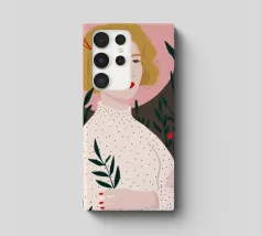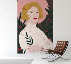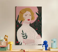 Ritratto di una donna pensierosa dai capelli biondi, le cui forme si intrecciano con un ramo delicato e frondoso, su uno sfondo rosa tenue, creando una composizione dolce e poetica.