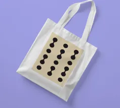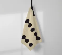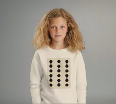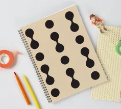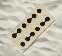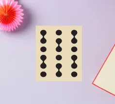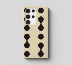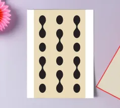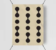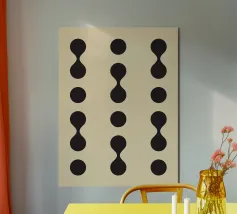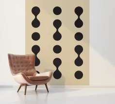 Forme astratte nere che ricordano clessidre e cerchi sono disposte in file verticali. Il motivo simmetrico crea un effetto visivo equilibrato e ritmico.