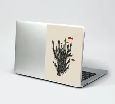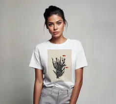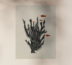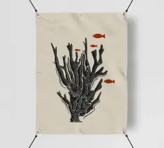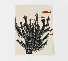 Questo accattivante poster in stile linoleografico mostra l'intricata bellezza di una formazione corallina, accompagnata da piccoli pesci rossi che nuotano con grazia intorno ad essa. L'audace silhouette nera del corallo contrasta nettamente con il delicato movimento dei pesci, simboleggiando l'armonia e la fragilità della vita marina. Le texture intagliate a mano aggiungono un'atmosfera grezza e organica, rendendo quest'opera d'arte perfetta per gli amanti degli oceani, per i sostenitori della conservazione o per chiunque apprezzi il design ispirato alla natura.