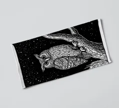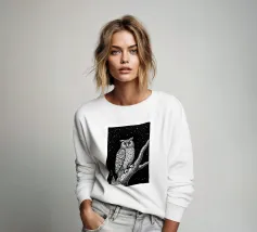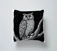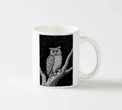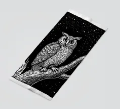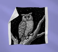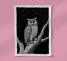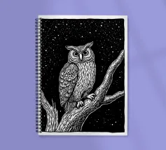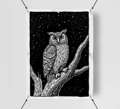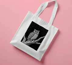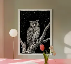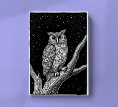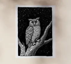 Una suggestiva illustrazione in bianco e nero in stile linoleografia di un gufo appollaiato su un albero sotto un cielo notturno stellato. Gli intricati dettagli delle piume del gufo e della corteccia dell'albero creano un contrasto ipnotico con lo sfondo scuro, evocando un senso di mistero e saggezza.