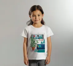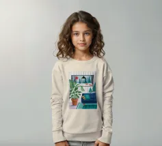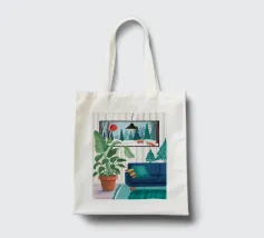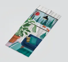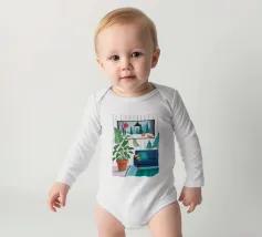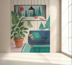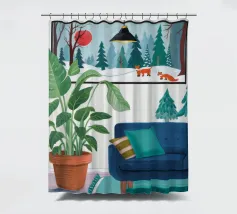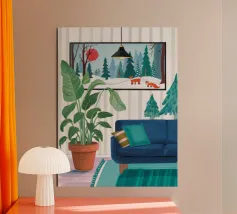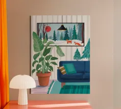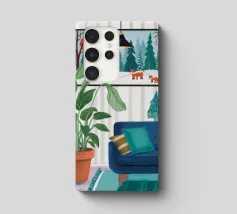 Una scena d'interni incorniciata da una vista esterna innevata e da rigogliose piante da interno esprime calore e solitudine contemplativa.