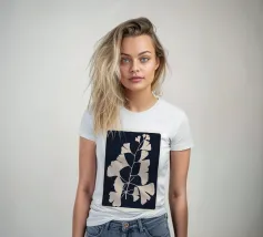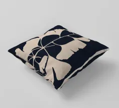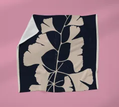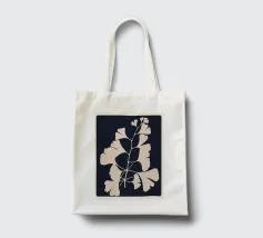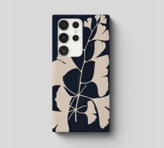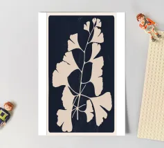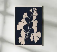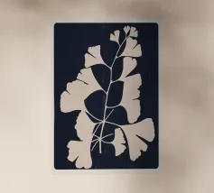 Una silhouette botanica minimale con foglie a ventaglio su sfondo scuro, presentata in uno stile semplice e grafico.