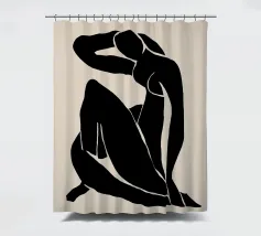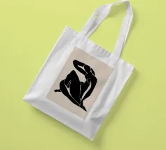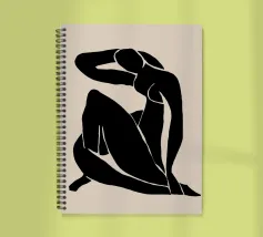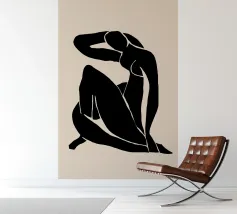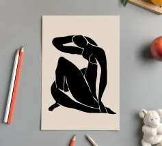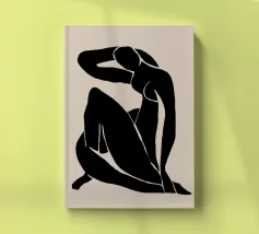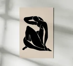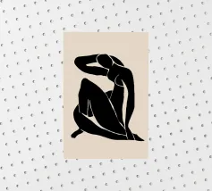 Elegante silhouette astratta di una persona seduta con un braccio sollevato dietro la testa e l'altro appoggiato sul ginocchio, catturata in nero pieno su uno sfondo beige. Le linee e la forma minimalista trasmettono un senso di contemplazione e relax.