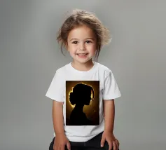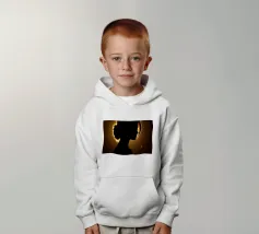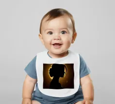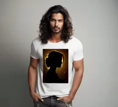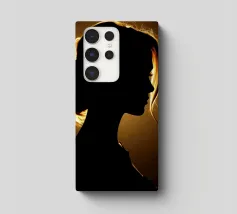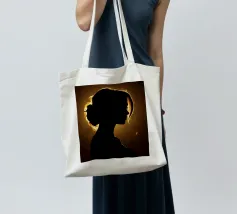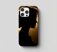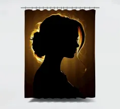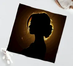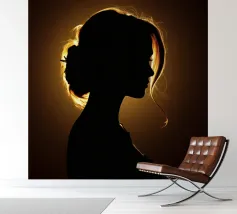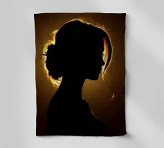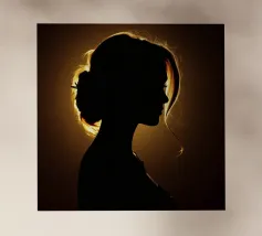 Una donna è in posa di profilo, i suoi capelli brillano sottilmente su uno sfondo caldo. La luce soffusa evidenzia i contorni della sua silhouette, creando un'atmosfera calma e sognante.