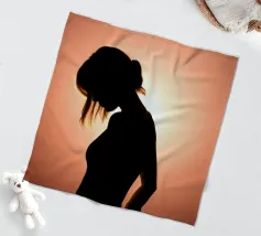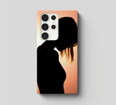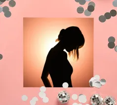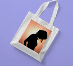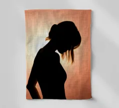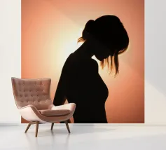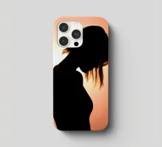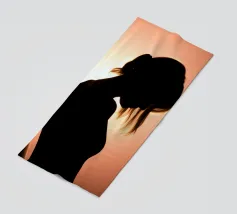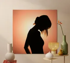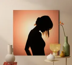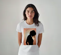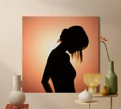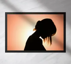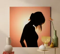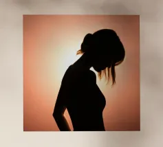 Una donna si trova all'aperto, la sua silhouette è evidenziata da un vibrante tramonto. I colori caldi formano un bellissimo sfondo mentre la donna guarda pensierosa verso il basso.