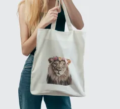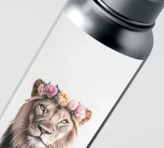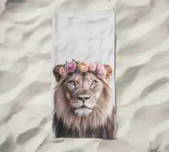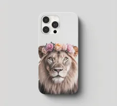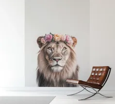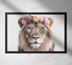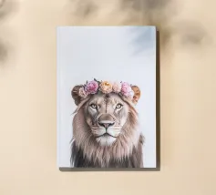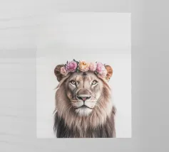 Il ritratto di un leone mostra grandi occhi espressivi e una colorata corona di fiori. La morbida pelliccia è perfettamente accentuata in un'illustrazione fotografica minimalista e cattura lo straordinario fascino della natura. Ideale per gli amanti degli animali.