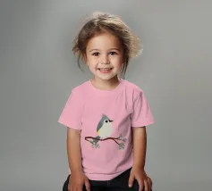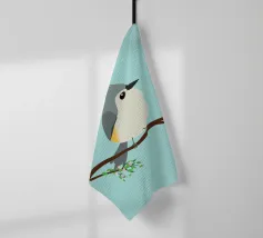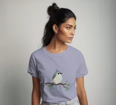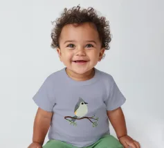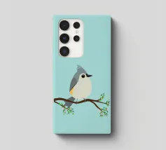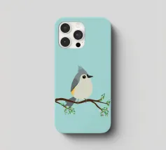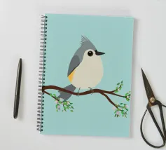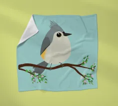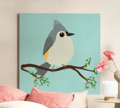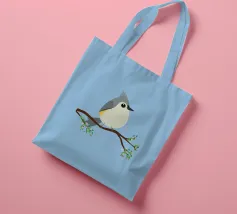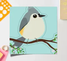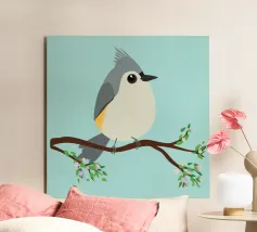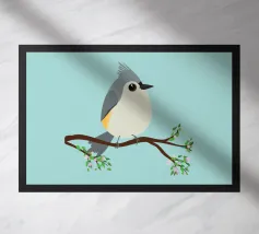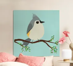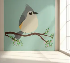 Illustrazione vettoriale di una simpatica cincia dal ciuffo a forma di uovo. L'uccello è seduto su un ramo con fiori e foglie.