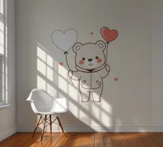 Un affascinante orso si erge fiducioso, tenendo un palloncino bianco e rosso a forma di cuore in ogni zampa, irradiando felicità e affetto, adatto a varie celebrazioni.