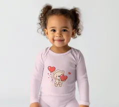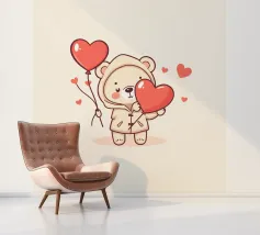 Un affascinante personaggio orso con un'accogliente felpa con cappuccio, che tiene gioiosamente in mano un grande cuore e palloncini colorati, circondato da cuori galleggianti, evocando un giocoso spirito di San Valentino.