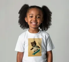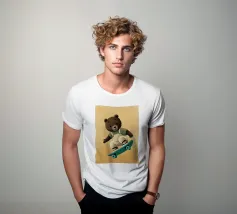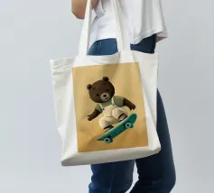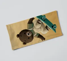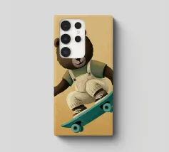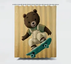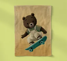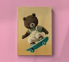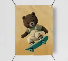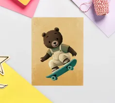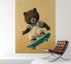 Un simpatico orsetto salta su uno skateboard, indossando una salopette color crema e una maglietta verde. Questa illustrazione calda e divertente, piena di movimento, è perfetta per la cameretta di un bambino o per un arredamento giocoso. Un disegno che unisce sport, tenerezza e spirito da cartone animato, ideale per gli appassionati di animali buffi e scene felici. Un tocco di dolce energia per ravvivare qualsiasi parete.