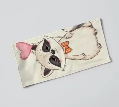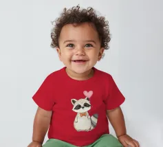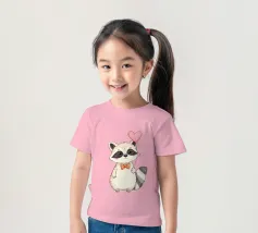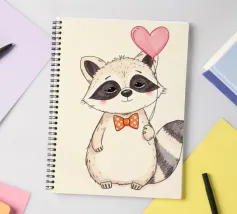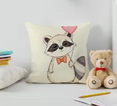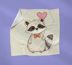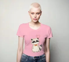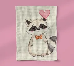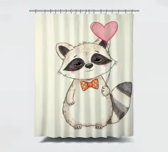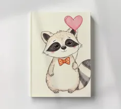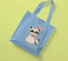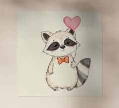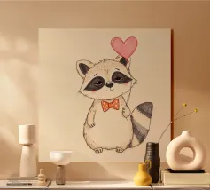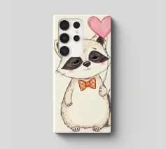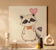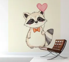 Un affascinante procione sta in piedi con un palloncino a forma di cuore in una zampa, ornato da un papillon a pois. La sua dolce espressione contribuisce a creare un'atmosfera gioiosa.