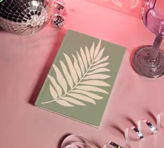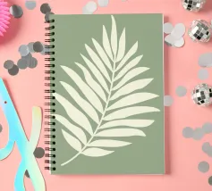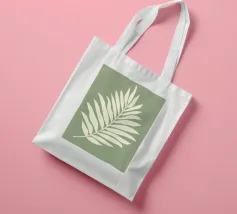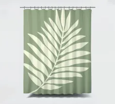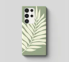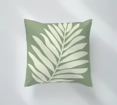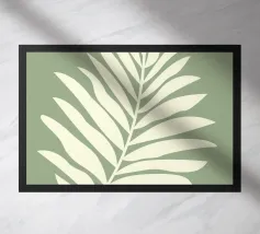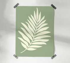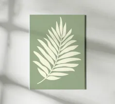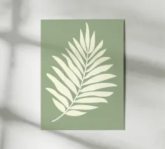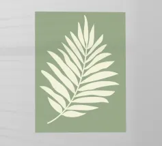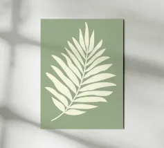 Una semplice rappresentazione di una foglia chiara con fronde allungate si staglia su uno sfondo verde tenue. Il design minimalista sottolinea l'eleganza e la simmetria delle forme naturali.