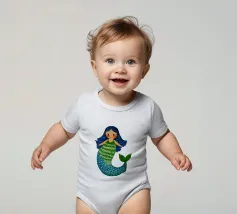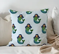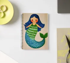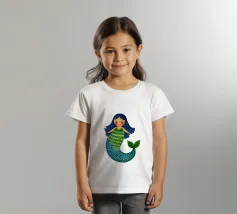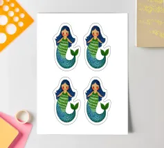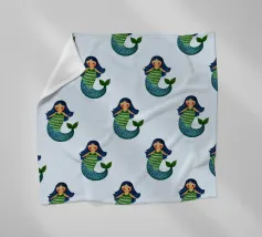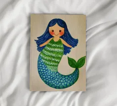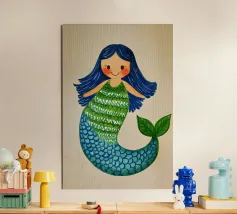 L'illustrazione mostra un'allegra sirena con lunghi e fluenti capelli blu, guance rosee e un ampio sorriso. La sua parte superiore ricorda le squame di un pesce e la sua pinna caudale è blu con accenti verdi. Lo stile è giocoso e infantile, con linee pulite e colori vivaci. La texture sullo sfondo conferisce all'immagine un tocco artigianale e affascinante.