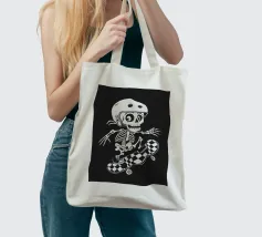 Uno scheletro dei cartoni animati che indossa un casco si muove allegramente sullo skateboard, mostrando il suo lato giocoso. Lo skateboard presenta un caratteristico motivo a scacchi bianchi e neri.