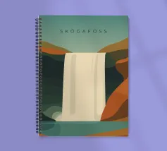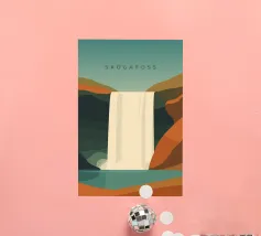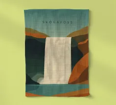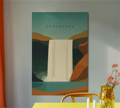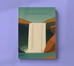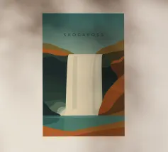 Design da viaggio minimalista dell'Islanda con la famosa cascata Skogafoss in stile stilizzato. Ideale per tutti coloro che amano questo splendido Paese scandinavo con la sua impressionante natura.