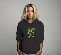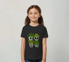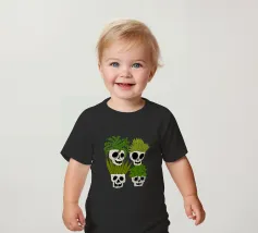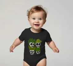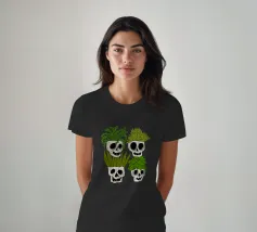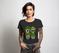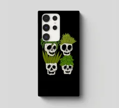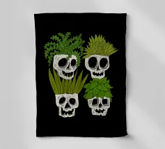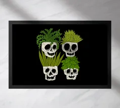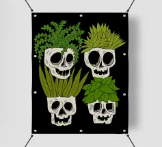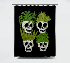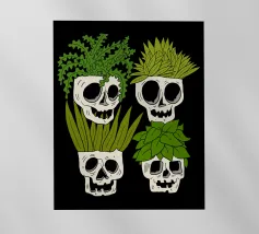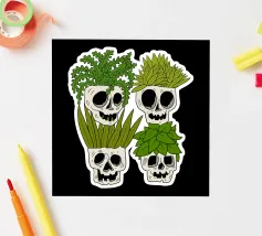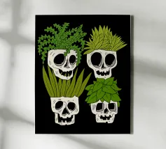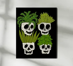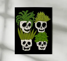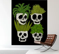 Design giocoso con eccentrici vasi a forma di teschio riempiti di rigogliose piante d'appartamento. Perfetto per gli amanti delle piante con senso dell'umorismo, questo motivo unico aggiunge un tocco di divertimento e fascino a qualsiasi spazio.