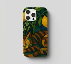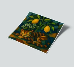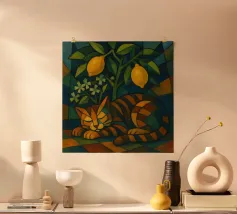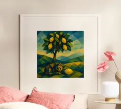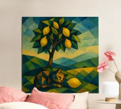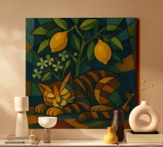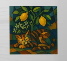 Una serena composizione cubista di un gatto addormentato che riposa pacificamente sotto un albero di limoni. Forme geometriche audaci e colori ricchi e contrastanti catturano un momento di tranquillità infuso di astrazione artistica.