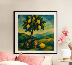 Una serena composizione cubista di un gatto addormentato che riposa pacificamente sotto un albero di limoni. Forme geometriche audaci e colori ricchi e contrastanti catturano un momento di tranquillità infuso di astrazione artistica.