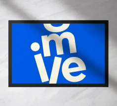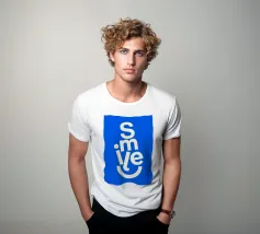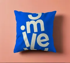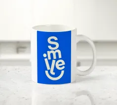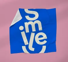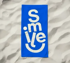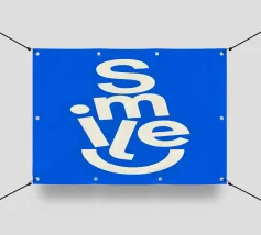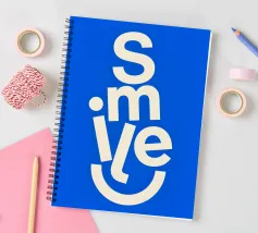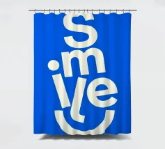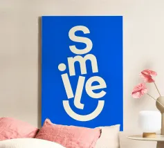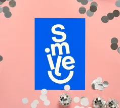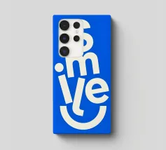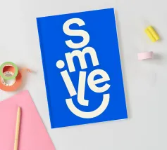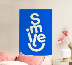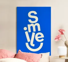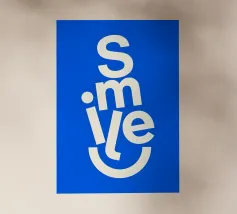 Un design tipografico creativo della parola "SMILE" su uno sfondo blu brillante. Le lettere sono disposte verticalmente con una spaziatura giocosa e la "U" in basso, che fa parte della "L", ricorda un volto sorridente.