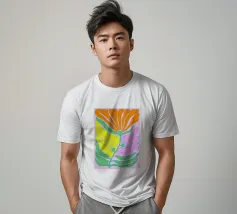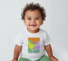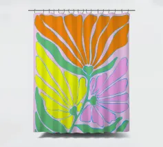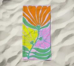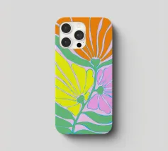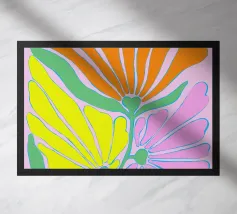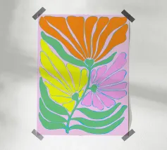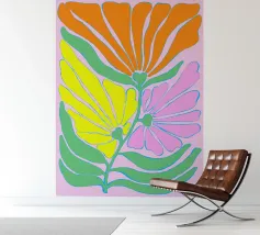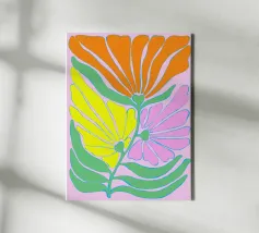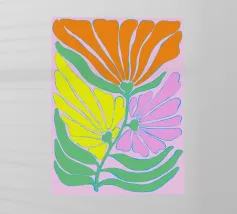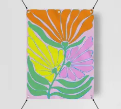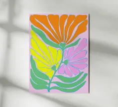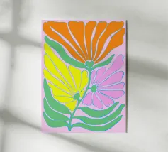 Questa colorata illustrazione mostra fiori stilizzati nelle vivaci tonalità dell'arancio, del giallo, del rosa e del verde. Le linee chiare e le aree di colore armoniose conferiscono al motivo estivo un carattere moderno e allegro. Un'opera d'arte giocosa che irradia leggerezza, natura ed energia positiva.