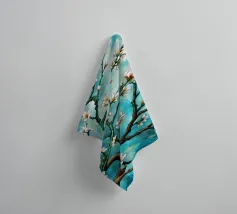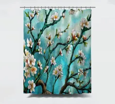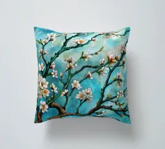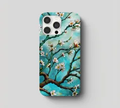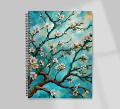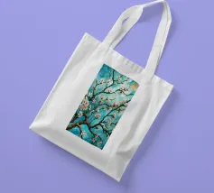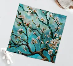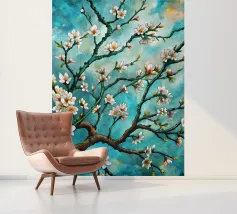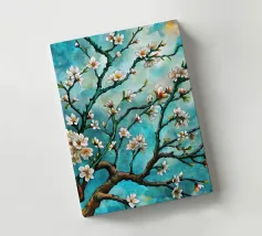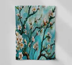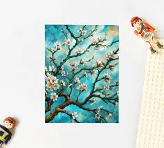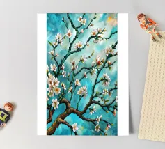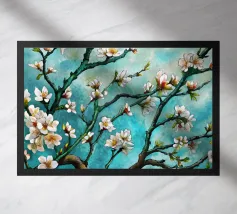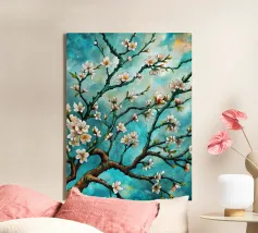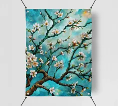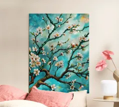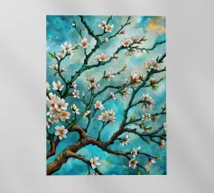 Un dipinto vibrante ed espressivo di un albero in fiore sullo sfondo di un cielo blu brillante. I delicati fiori bianchi contrastano splendidamente con i rami scuri e la tela blu vivida, creando un senso di serenità e rinnovamento.