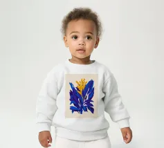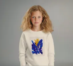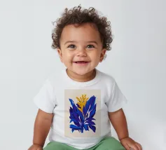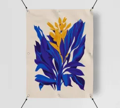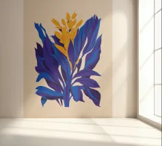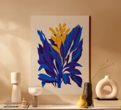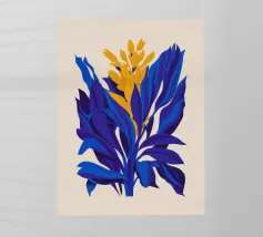 Le audaci foglie blu cobalto sono disposte in una composizione dinamica su uno sfondo beige, in uno stile ritagliato che ricorda Maraoui, creando una dichiarazione botanica potente e artistica.