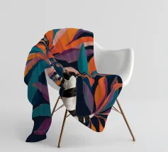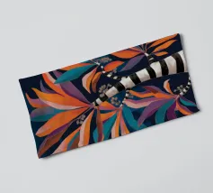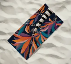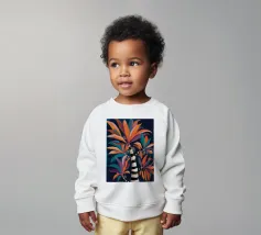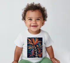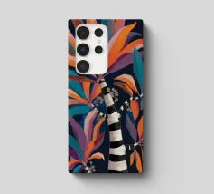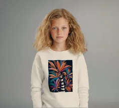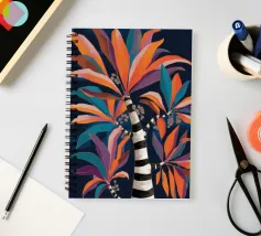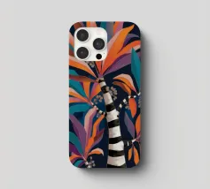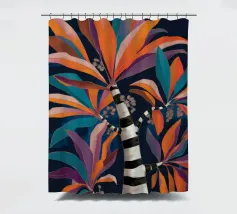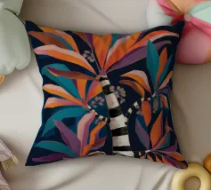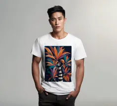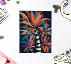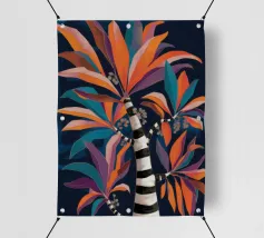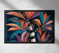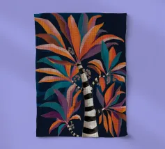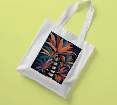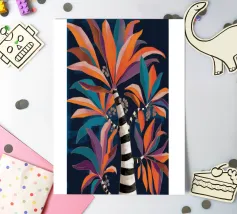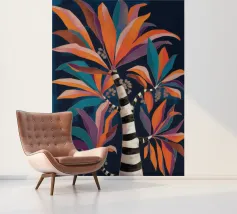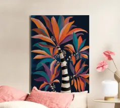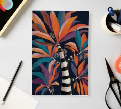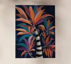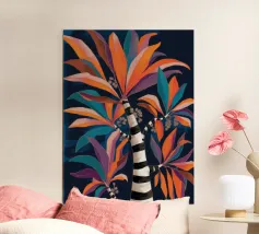Una vibrante illustrazione astratta di una donna con un top a righe bianche e nere, circondata da una giungla di foglie di palma colorate e stilizzate. La composizione è una fusione audace, moderna ed elegante di moda e natura.