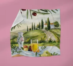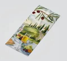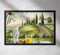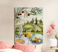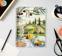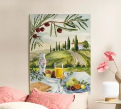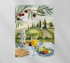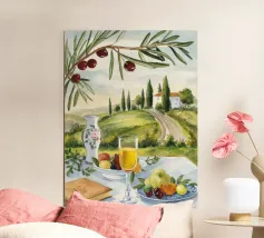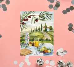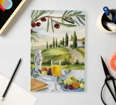 Un picnic in vigna a base di vino, pesche, libri e olive si apre su un sentiero illuminato dal sole della campagna toscana.