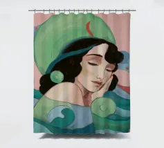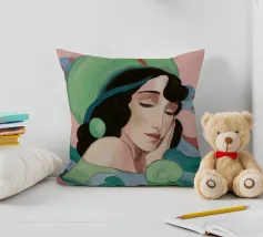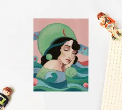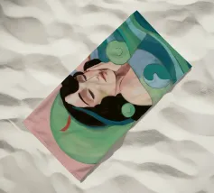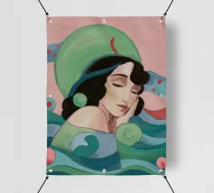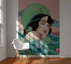 Ritratto sereno di una donna con gli occhi chiusi e i capelli scuri, che indossa un foulard o un cappello dai vivaci motivi verdi e rosa, su uno sfondo con motivi stilizzati a onda.