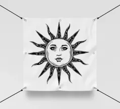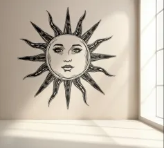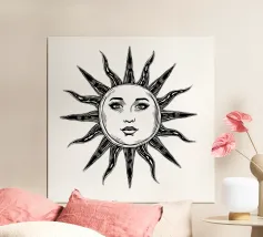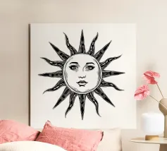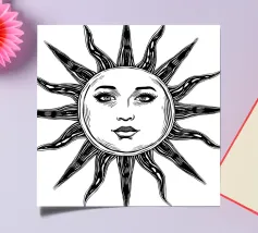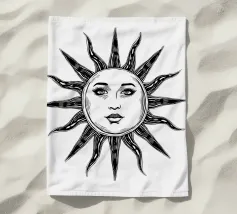 Un'ipnotica illustrazione in bianco e nero di un sole radioso dal volto umano. Gli occhi espressivi e le labbra delicate del sole gli conferiscono una presenza mistica e celestiale, mentre i suoi raggi strutturati si estendono verso l'esterno in un disegno organico e fluente. L'opera fonde simbolismo e natura, evocando temi di calore, energia e armonia cosmica.