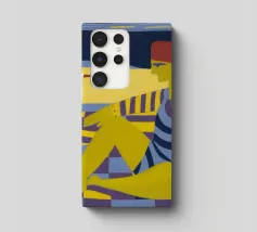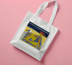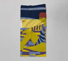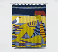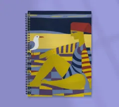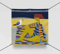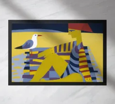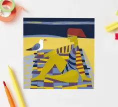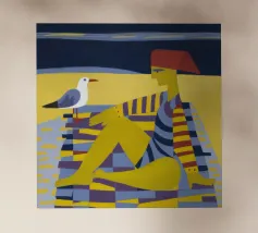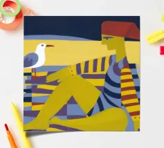 Illustrazione di una donna che prende il sole su un asciugamano colorato e a fantasia su un molo, con un gabbiano nelle vicinanze. L'opera d'arte cattura un perfetto momento di relax al mare con uno stile moderno e grafico.