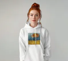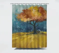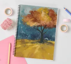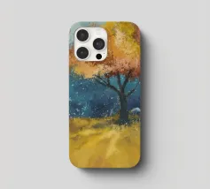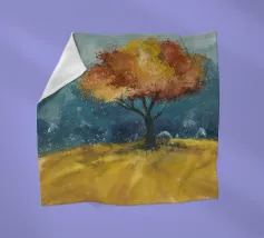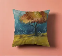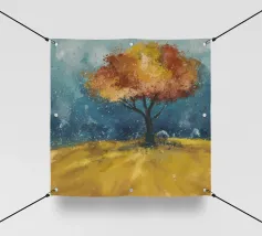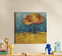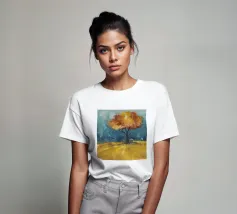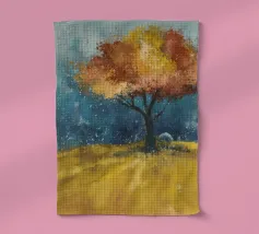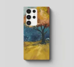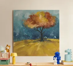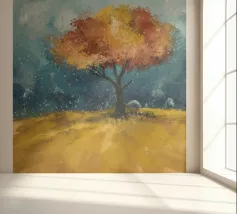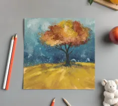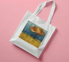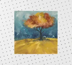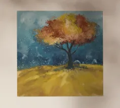 Un albero solitario si erge fiero su un campo dorato sotto un cielo sognante, crogiolandosi in una luce silenziosa.