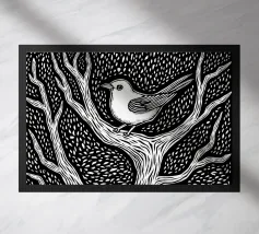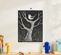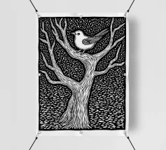 Questa stampa in stile linoleografico presenta un uccello appollaiato sui rami contorti di un albero senza foglie. L'intricato lavoro al tratto e il contrasto deciso creano un senso di consistenza e movimento, evocando un'atmosfera tranquilla ma dinamica. L'uccello, con i suoi dettagli delicati, si erge a simbolo di resilienza e solitudine contro lo sfondo scuro e modellato.