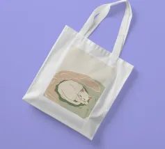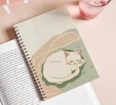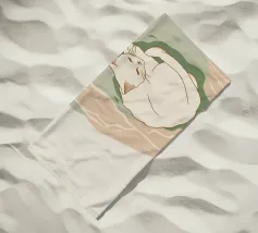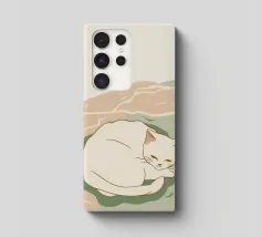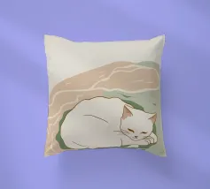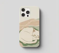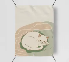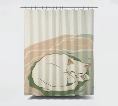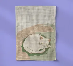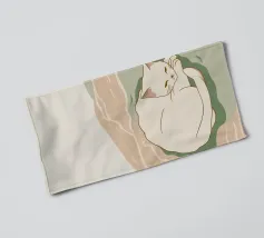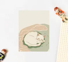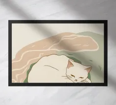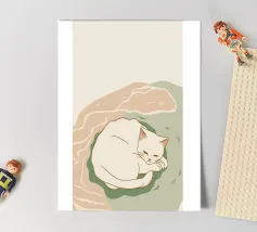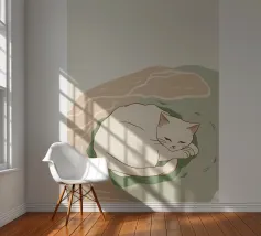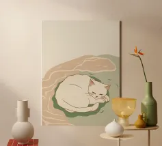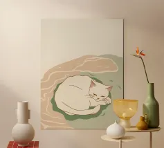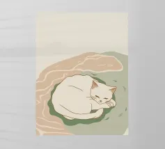 Un gatto bianco dorme raggomitolato su una superficie con forme astratte e fluide di colore beige e verde. La composizione è morbida, serena e ha una qualità sognante, quasi astratta.