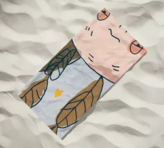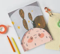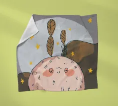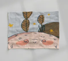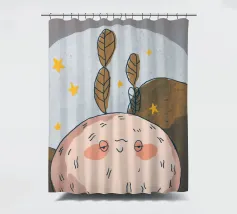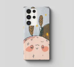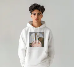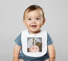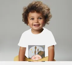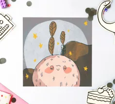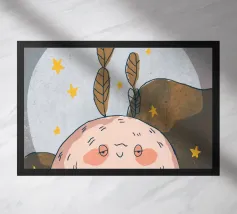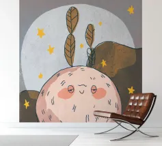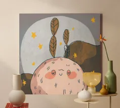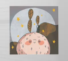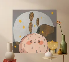 Questo dipinto presenta una grande lumaca con un'espressione gioiosa su un semplice sfondo grigio ornato da stelle e foglie, sottolineando la serenità e la delizia stravagante.