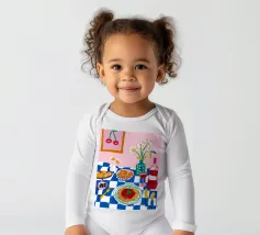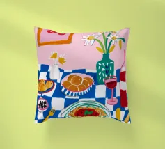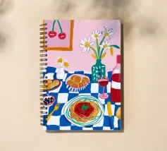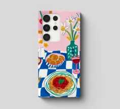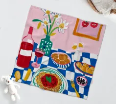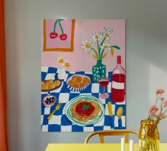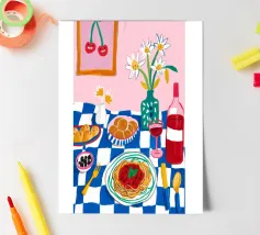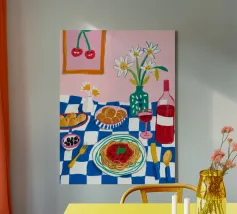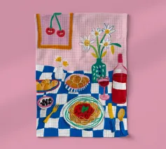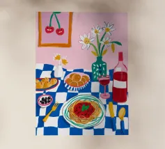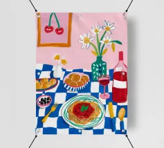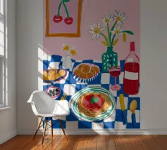 Una tavola stravagante con spaghetti, ciliegie, margherite e vino rosso su un panno a scacchi.