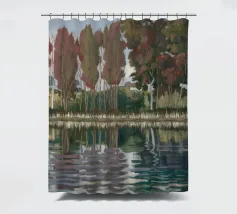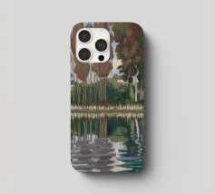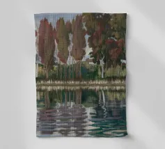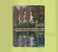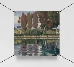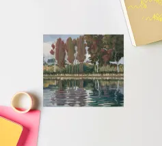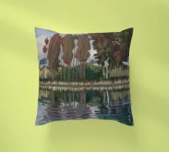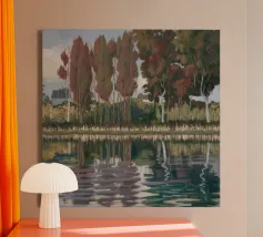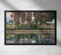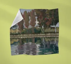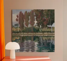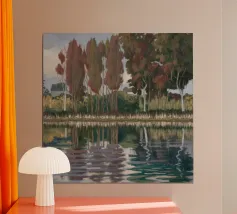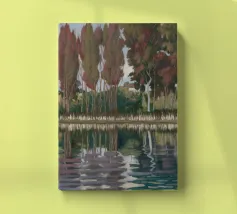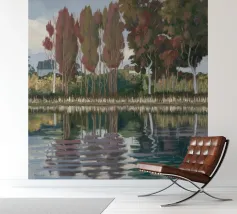 Alti alberi dai colori autunnali formano uno specchio perfetto su uno stagno immobile, sereno e luminoso.