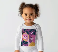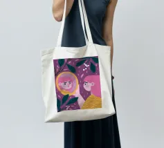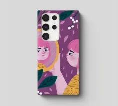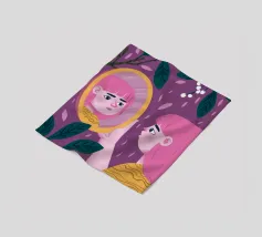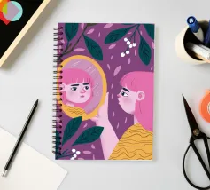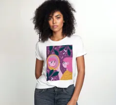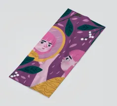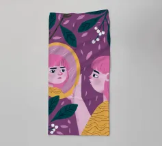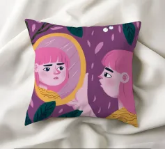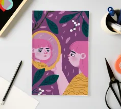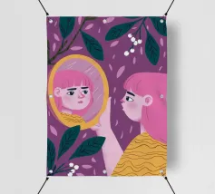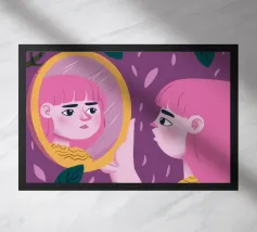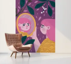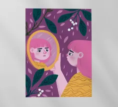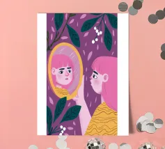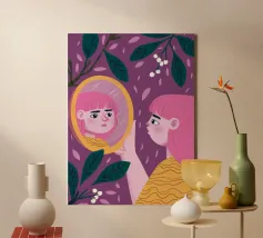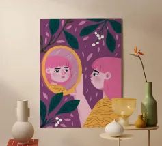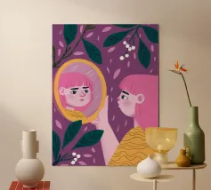 Il dipinto raffigura una persona con i capelli rosa, che si guarda in uno specchio che riflette la stessa persona. Lo sfondo è viola con foglie verdi.