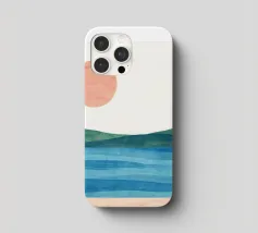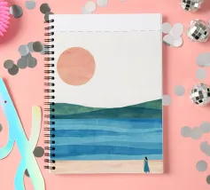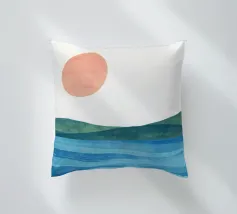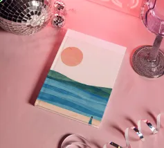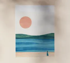 Una donna cammina da sola su una soffice spiaggia sabbiosa, il sole tramonta all'orizzonte in un caldo colore arancione e l'acqua azzurra lo lambisce dolcemente. Il dipinto esprime un senso di pace interiore e di connessione.