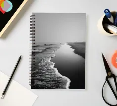 La costa con questa suggestiva opera d'arte in bianco e nero, caratterizzata da dolci onde che incontrano una costa scura e riflettente sotto un cielo morbido e nebbioso. Perfetto per un'estetica minimalista o moderna.