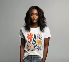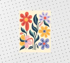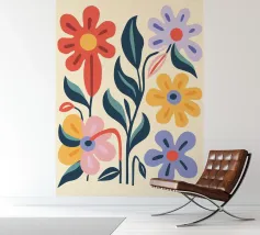 Un vivace motivo floreale nelle vibranti tonalità del rosso, del giallo e del viola, abbinato a eleganti foglie verdi. L'armoniosa combinazione di colori e la disposizione giocosa rendono questo disegno un'aggiunta elegante a qualsiasi interno. Perfetto per murales, cuscini, tazze e molto altro. Porta un'atmosfera fresca e allegra nella tua casa - ideale per gli amanti dell'arte e della natura che apprezzano i design moderni e creativi.