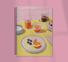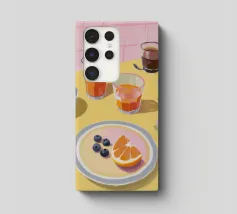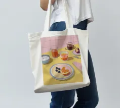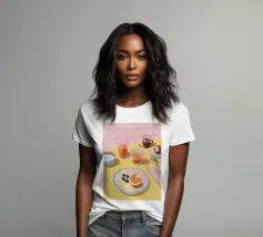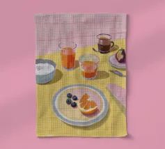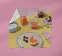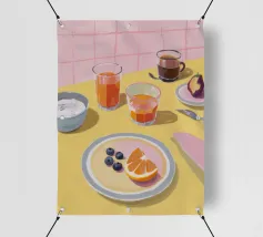 Uova, pane tostato, frutta e marmellata giacciono pacificamente su piatti di lavanda in una scena mattutina da sogno.