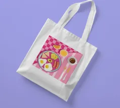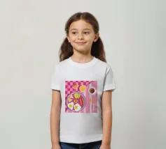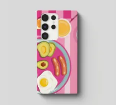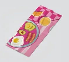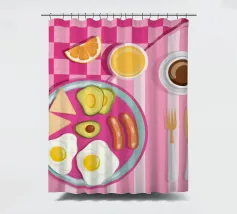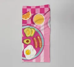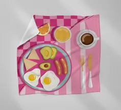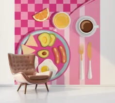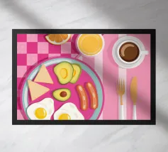 Vista dall'alto verso il basso di un piatto da colazione colorato con uova, olive e fette d'arancia, su uno sfondo a scacchi bianchi e rosa con una tazza di caffè.