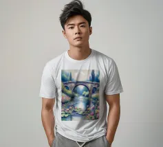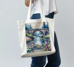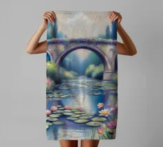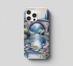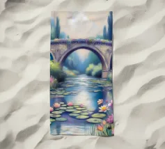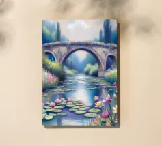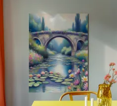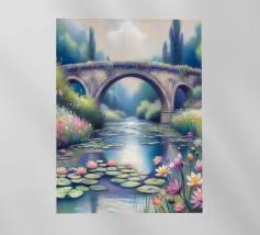Disegno a pastello di un ponte con laghetto di ninfee sottostante.