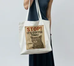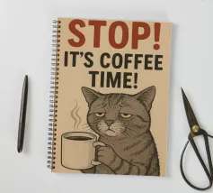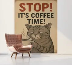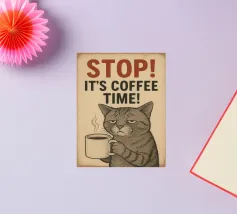 L'immagine presenta un disegno in stile cartone animato di un gatto soriano grigio dall'aspetto scontroso che tiene in mano una tazza di caffè fumante. Sopra il gatto, in grassetto e in maiuscolo, il testo recita "STOP! È L'ORA DEL CAFFÈ!". Lo sfondo è di colore beige chiaro e conferisce all'immagine un'atmosfera vintage o retrò. L'espressione del gatto è di stanchezza o fastidio, in contrasto con il messaggio invitante dell'ora del caffè.